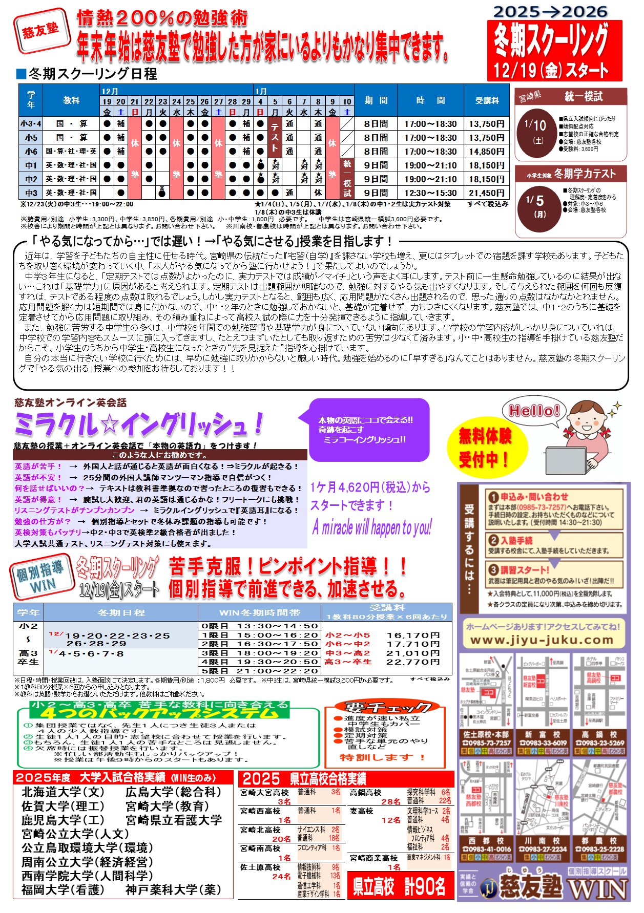 慈友塾は宮崎県内、宮崎市(佐土原町)・新富町・高鍋町・西都市・川南町・都農町 と幅広い地域の小学生・中学生・高校生を指導しております。